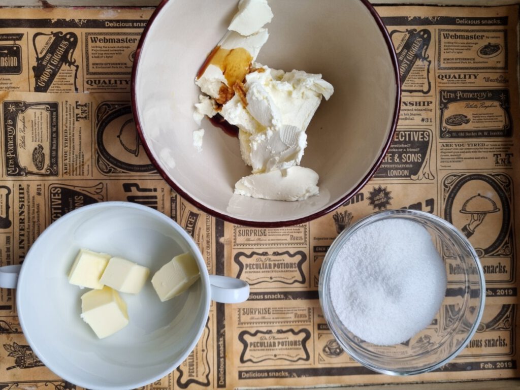 - den Frischkäse mit Milch, Puderzucker und Vanillezucker vermischen, bis die Konsistenz passt